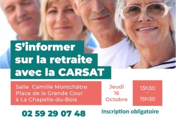 Jeudi 16 octobre de 13h30 à 15h30 – Salle associative Camille MontchâtrePlace de la Grande Cour à La Chapelle-du-Bois (72400)En partenariat avec la CARSAT des Pays de La Loire, France services propose une réunion d’information Lire la suite…