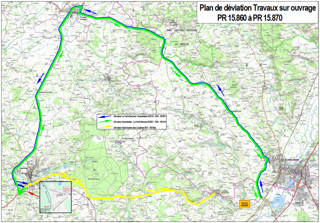 • Déviation côté La Ferté Bernard : D7, D316, D2, D301, Avenue du Docteur Monnier, D7 BIS vers D7