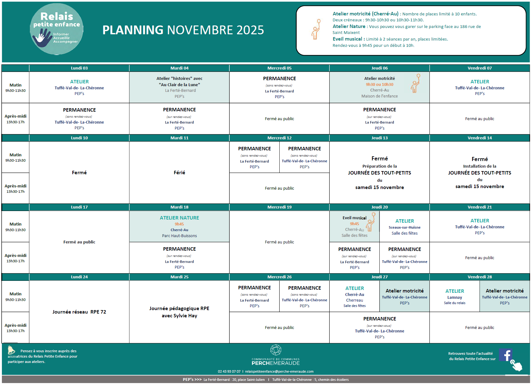 Calendrier des ateliers et permanences du Relais Petite Enfance