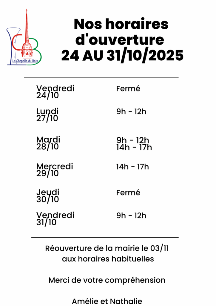 Horaires d’ouverture de la Mairie du 24 au 31 octobre 2025