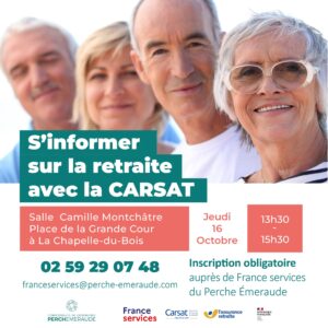 Jeudi 16 octobre de 13h30 à 15h30 – Salle associative Camille MontchâtrePlace de la Grande Cour à La Chapelle-du-Bois (72400)En partenariat avec la CARSAT des Pays de La Loire, France services propose une réunion d’information pour comprendre la retraite, animée par un conseiller retraite d’une durée de 2 heures. Au […]
