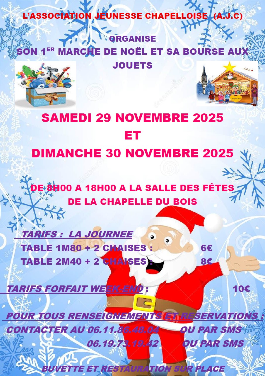 29 novembre @ 8h00 - 30 novembre @ 18h00 Marché de Noël organisé par l’AJC Salle des fêtes Place de la Grande Cour-, La Chapelle du Bois