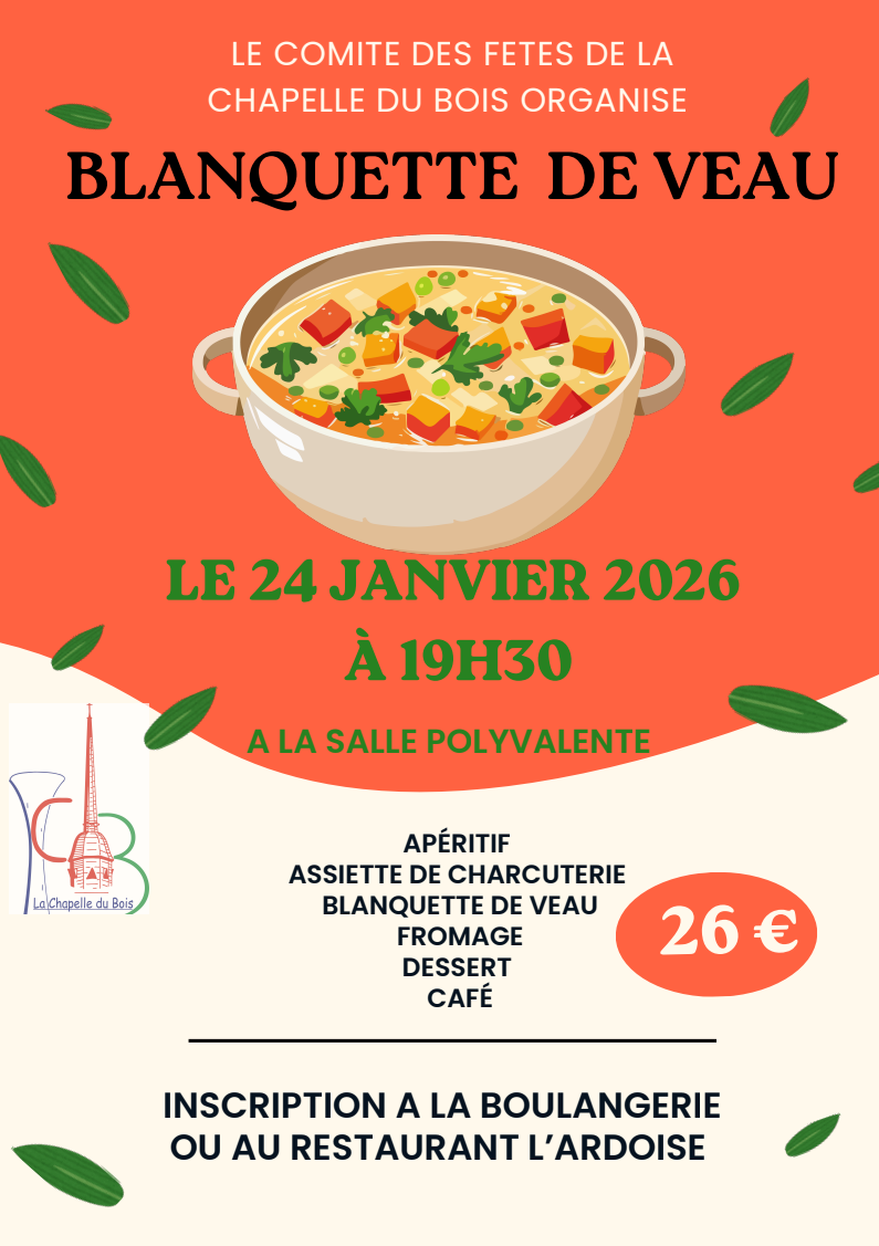 24 janvier 2026 @ 19h30 - 23h30 Blanquette de veau – Comité des fêtes Salle des fêtes Place de la Grande Cour-, La Chapelle du Bois